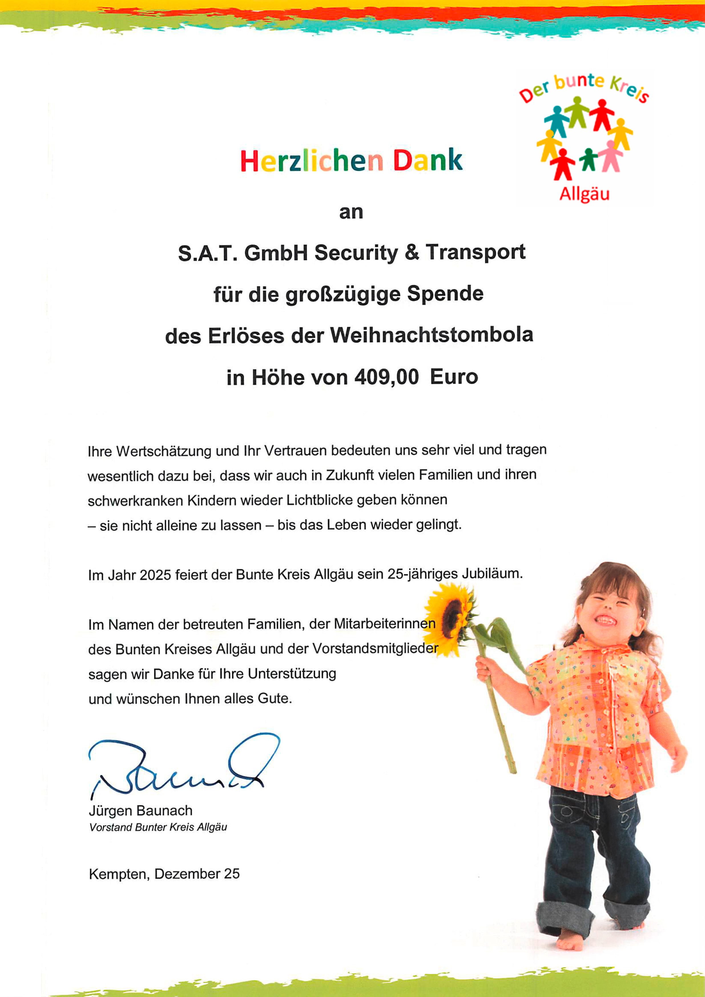 Die S.A.T. GmbH Security & Transport Corporation, mit Sitz in Legau, zeigt erneut ihr soziales Engagement und spendet 409 Euro an den Bunten Kreis Allgäu. Die Spende stammt aus den Erlösen der Weihnachts-Tombola und unterstreicht die Verbundenheit des Unternehmens mit der Region und den Menschen, die hier leben.